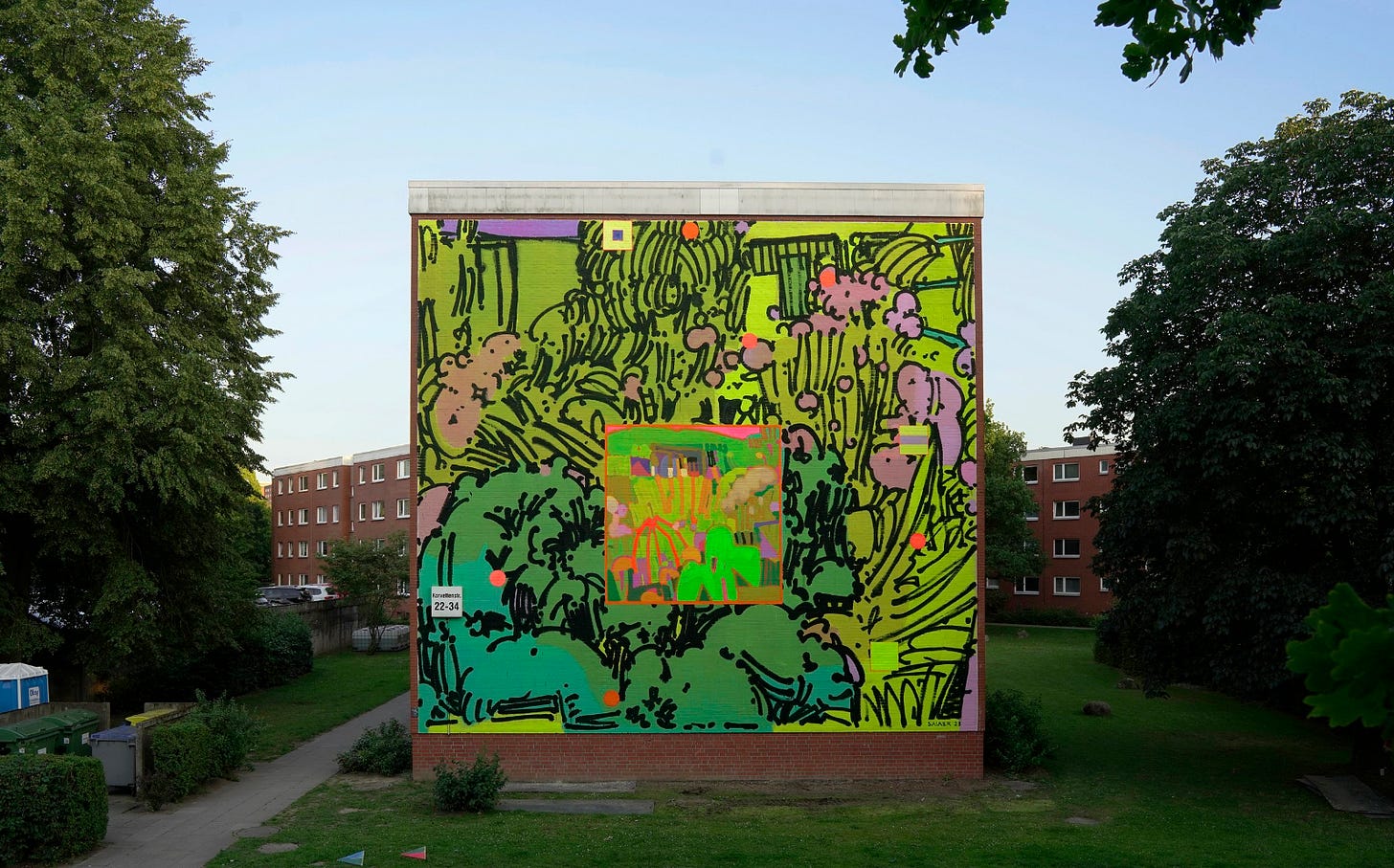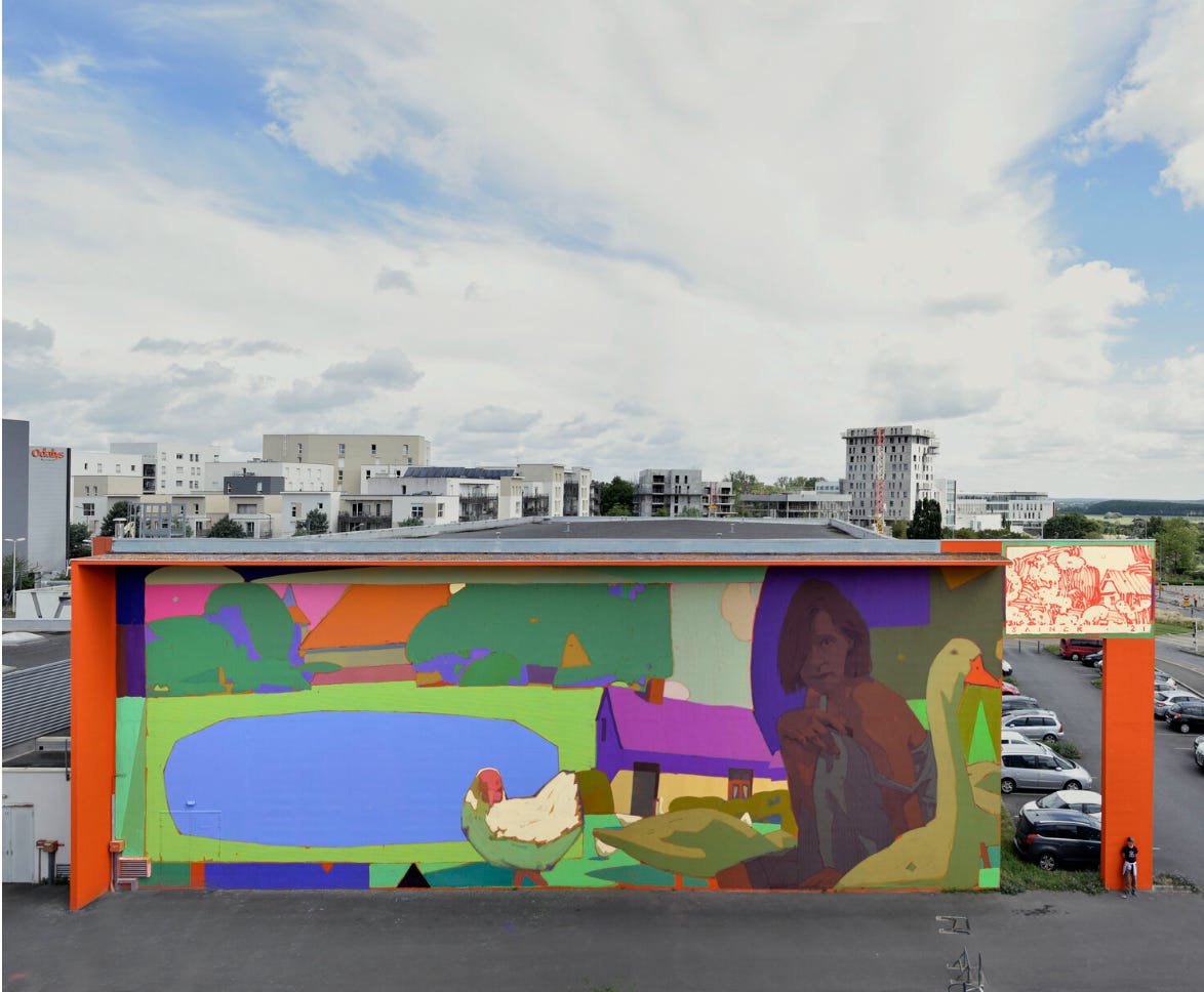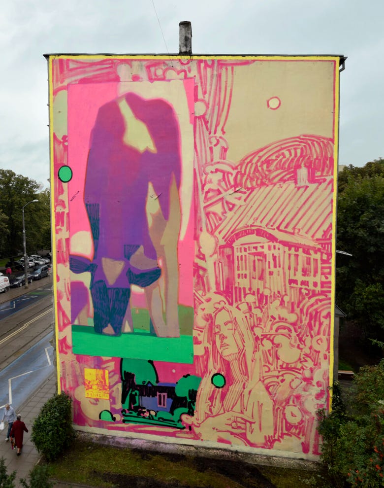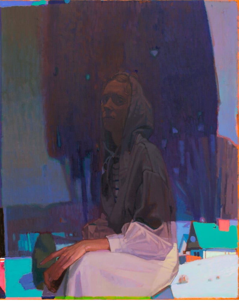 The theme of framing and multiple viewings also appears in Sainer’s earlier works as well, just in a slightly different way. Some paintings seem to be divided or split between two perspectives or moods, while others harbor moody shadows that interrupt otherwise oversaturated neon worlds. Take for example the mural Nemanja below, or the paintings Zima with Korbielowie and Two Landscapes. Here, he is not using neatly bounded sections or separate canvases but differences in light and sharpness of detail to frame parts of his paintings. In Zima with Korbielowie, it almost appears that a shade has been drawn down over this woman where she is sitting, leaving light enough only for her hand and sleeve.