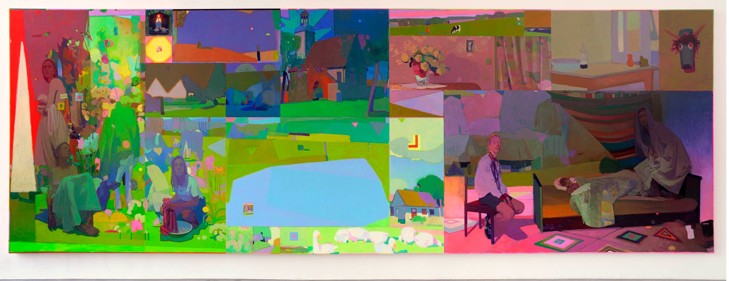 Especially in recent works, Sainer has allowed for multiple different ‘frames’ of vision to comprise a single piece. Sainer says that this multiplicity is a reaction to the ever-growing number of visual surfaces, lenses, and screens in our lives. To create this effect, he combines several separate canvases to create the impression of multiple frames of vision. Works like A Day in the Countryside (above) are crowded with perspectives. Viewers find themselves overwhelmed, all at once looking from many angles, at many lives, and possibly from different times. Each frame may contain memories, coexisting timelines, a closer look, or a world within a world.