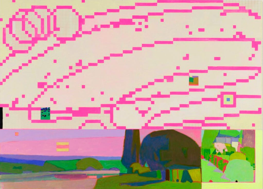 There are a couple of ways in which this idea appears at the surface of his art. Firstly, he uses imagery and line qualities that we tend to associate with digital worlds (think pixels, glitches). And like a phone or computer screen, some of his work seems to literally be aglow.